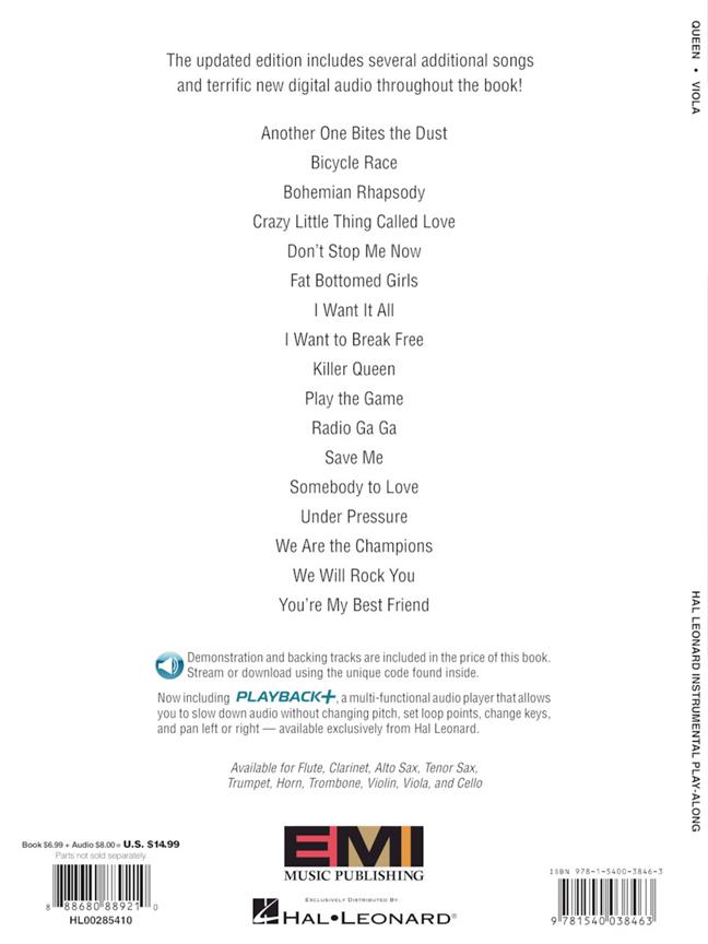 Solo instrumental arrangements with audio accompaniment for 17 songs from this seminal band: Another One Bites the Dust · Bohemian Rhapsody · Crazy Little Thing Called Love · Fat Bottomed Girls · Killer Queen · Radio Ga Ga · Somebody to Love · Under Pressure · We Are the Champions · We Will Rock You · You’re My Best Friend · and more. The audio is accessed online using the unique code inside each book and can be streamed or downloaded. The audio files include PLAYBACK+, a multi-functional audio player that allows you to slow down audio without changing pitch, set loop points, change keys, and pan left or right.